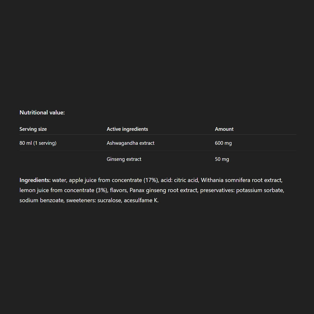 ASHWAGANDHA & PANAX GINSENG SHOT je ideálnou voľbou pre tých, ktorí denne čelia novým výzvam a chcú si udržať vitalitu, sústredenie a vnútornú rovnováhu.