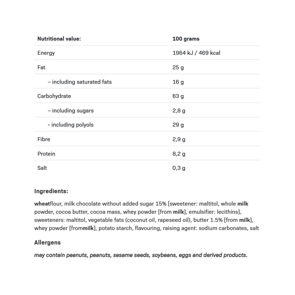 Maslové sušienky zdobené mliečnou čokoládou, bez pridaného cukru. Obsahuje sladidlo. Obsahuje prirodzene sa vyskytujúce cukry. Nepoužívajte, ak ste alergický (precitlivený) na ktorúkoľvek zo zložiek. Nadmerná konzumácia môže mať laxatívny účinok. Odporúča sa vyvážená strava a zdravý životný štýl. Môže obsahovať arašidy, orechy, sezam, sóju, vajcia a výrobky z nich. Minimálna trvanlivosť do / číslo šarže: pozri stranu obalu. Skladujte na chladnom a suchom mieste.