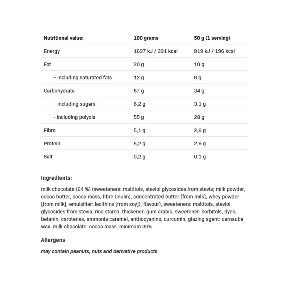 Dražé vyrobené z mliečnej čokolády s farebnou polevou, bez pridaného cukru. Obsahuje sladidlá. Môže obsahovať prirodzene sa vyskytujúce cukry. Nekonzumujte, ak ste alergickí alebo citliví na niektorú zo zložiek. Nadmerná konzumácia môže mať laxatívny účinok. Odporúča sa vyvážená strava a zdravý životný štýl. Môže obsahovať arašidy, orechy a ich deriváty.