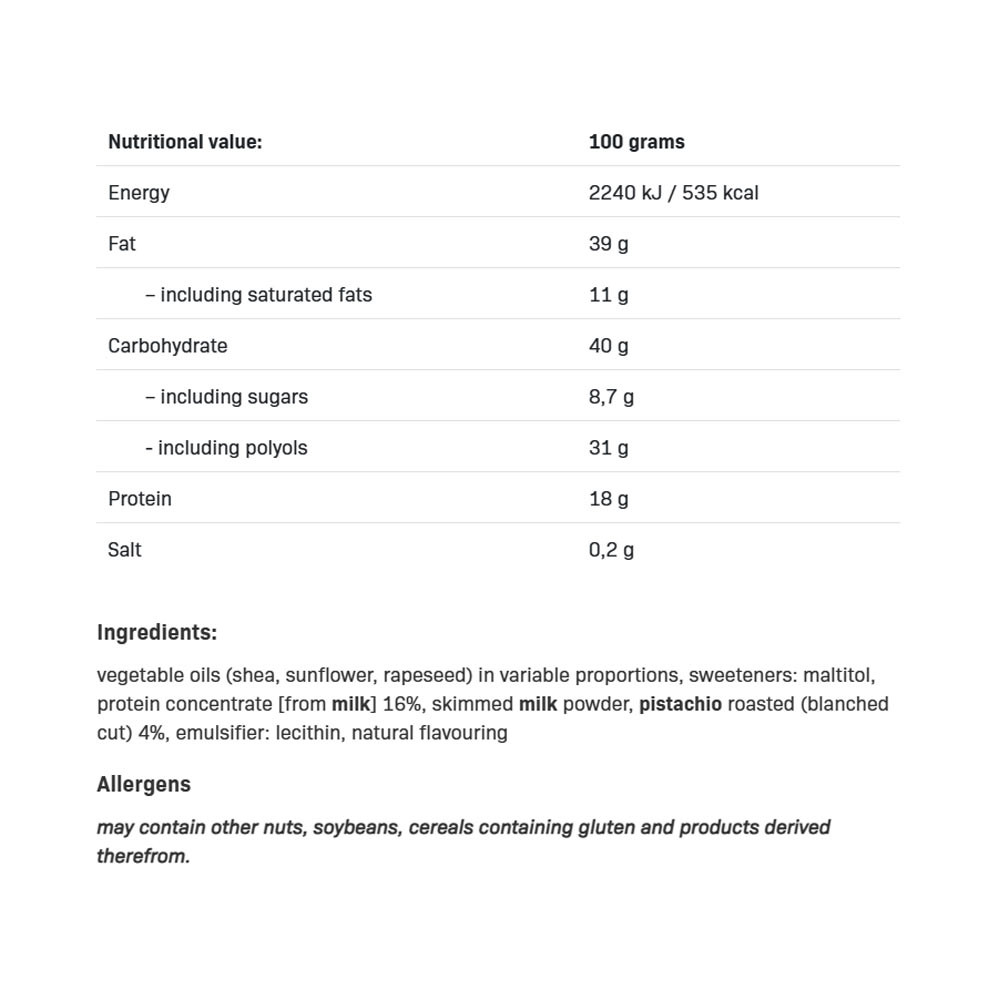 Pistáciový proteínový krém s príchuťou. Obsahuje sladidlo. Bez pridaného cukru. Obsahuje prirodzene sa vyskytujúce cukry. Zdroj bielkovín. Nekonzumujte, ak ste citliví na ktorúkoľvek zo zložiek. Nadmerná konzumácia môže mať laxatívny účinok. Používajte podľa potreby k jedlám, dezertom alebo ako nátierku. Pred použitím premiešajte. Odporúča sa vyvážená strava a zdravý životný štýl. Môže obsahovať stopy iných orechov, sóje, obilnín obsahujúcich lepok, horčice a ich derivátov. Dátum minimálnej trvanlivosti / číslo šarže: viď viečko. Skladujte na chladnom, suchom a vzdušnom mieste pri izbovej teplote. Farba alebo konzistencia výrobku sa môže počas skladovania zmeniť, čo však neovplyvňuje jeho kvalitu.