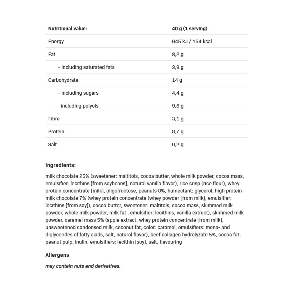 ALLNUTRITION FITKING PROTEIN SNACK BAR je chutná, vysokoproteínová tyčinka vyrobená zo starostlivo vybraných ingrediencií. Je plná jemnej, hebkej náplne, obalená mliečnou čokoládou s chrumkavými orieškami – a to všetko bez pridaného cukru!