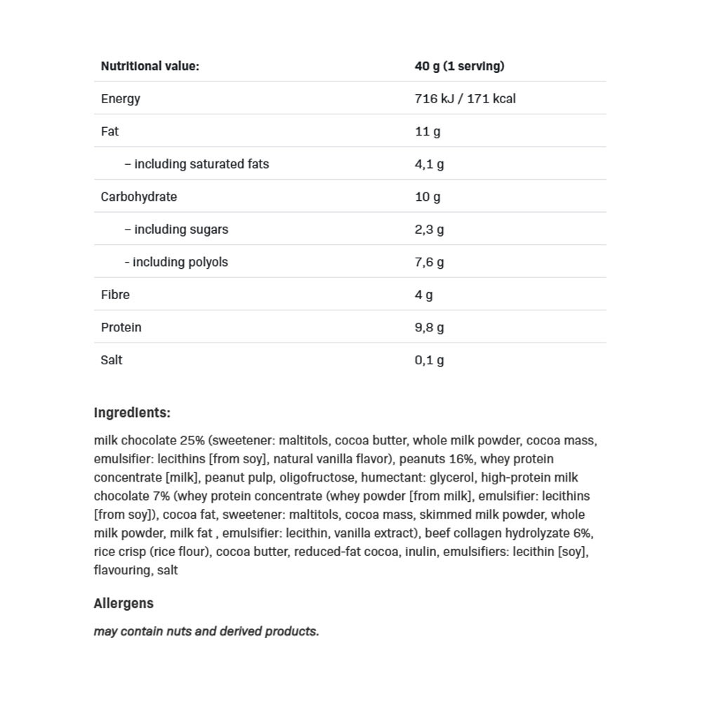 ALLNUTRITION FITKING PROTEIN SNACK BAR je chutná, vysokoproteínová tyčinka vyrobená zo starostlivo vybraných ingrediencií. Je plná jemnej, hebkej náplne, obalená mliečnou čokoládou s chrumkavými orieškami – a to všetko bez pridaného cukru!
