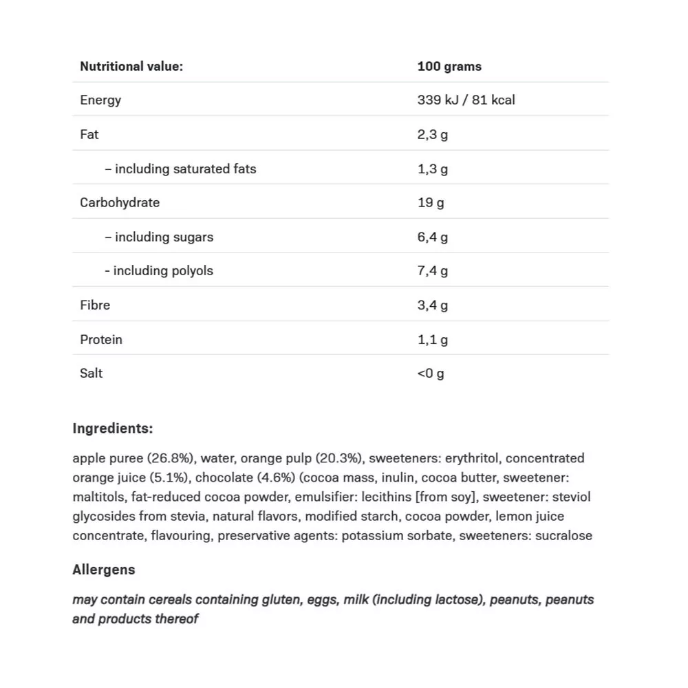 ALLNUTRITION Choco In Jelly Orange vytvára dokonalú kombináciu sladkej čokolády a sviežej, mierne kyslej chuti pomaranča. Vďaka svojej výraznej a originálnej chuti s vami zostane dlhšie. Rad FRULOVE ide priamo z vášho žalúdka do vášho srdca – a je to niečo, o čo sa môžete podeliť so svojimi blízkymi.