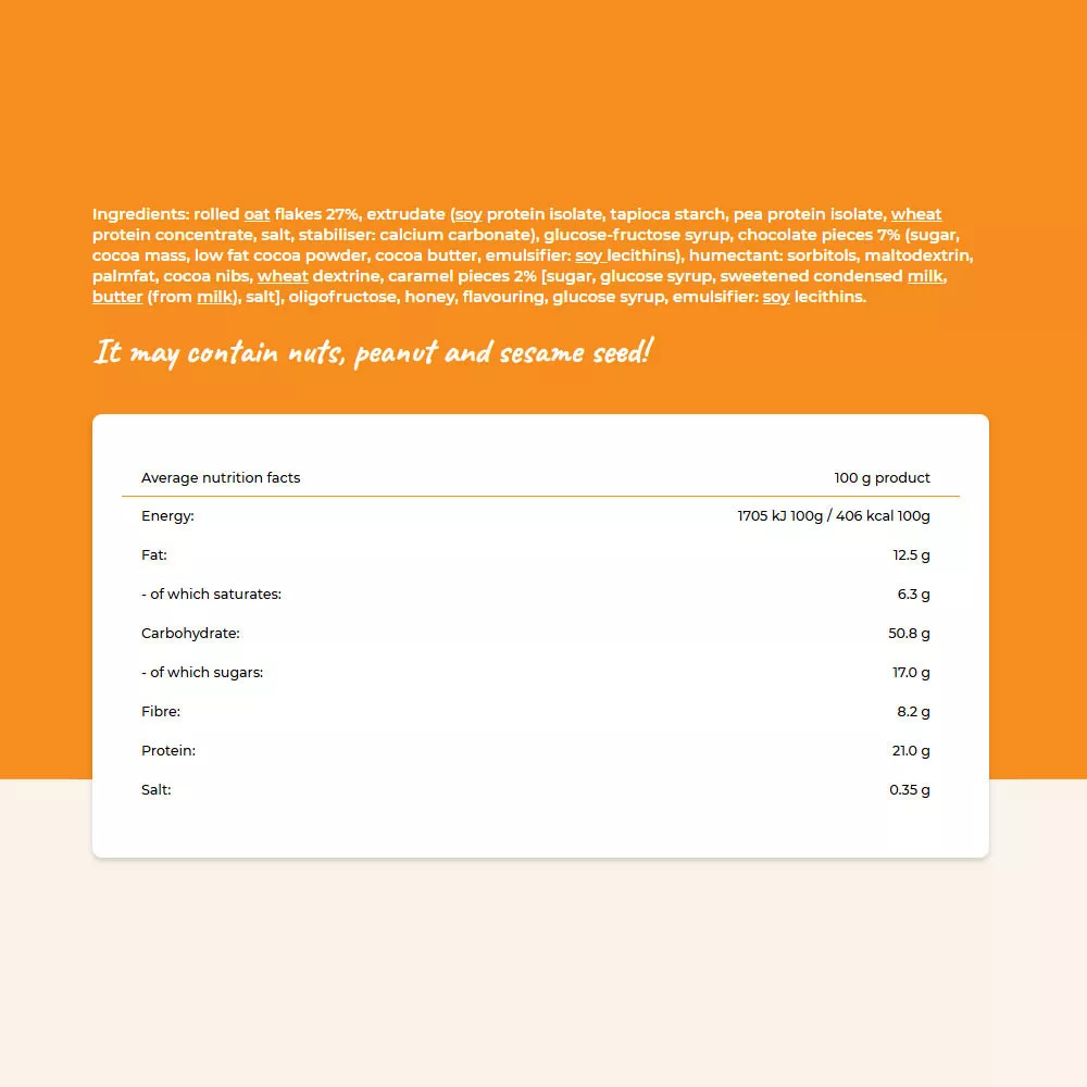 Zloženie: ovsené vločky 27%, extrudát (sójový proteínový izolát, tapiokový škrob, hrachový proteínový izolát, pšeničný proteínový koncentrát, soľ, stabilizátor: uhličitan vápenatý), glukózo-fruktózový sirup, kúsky čokolády 7% (cukor, kakaová hmota, nízkotučný kakaový prášok, kakaové maslo, emulgátor: sójový lecitín), zvlhčovadlo: sorbitol, maltodextrín, palmový tuk, kakaové kúsky, pšeničný dextrín, kúsky karamelu 2% [cukor, glukózový sirup, sladené kondenzované mlieko, maslo (z mlieka), soľ], oligofruktóza, med, aróma, glukózový sirup, emulgátor: sójový lecitín.