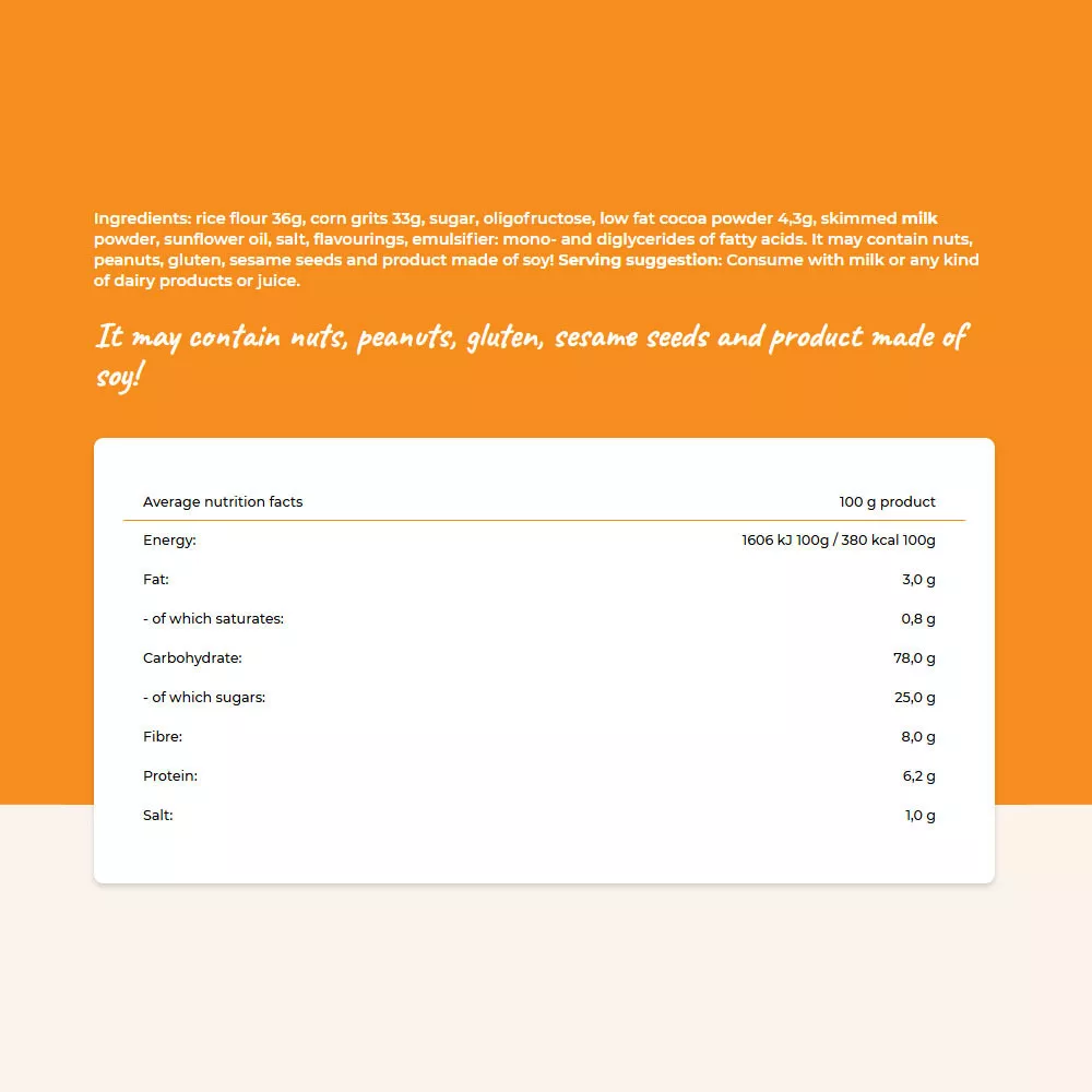 Zloženie: ryžová múka 36g, kukuričná krupica 33g, cukor, oligofruktóza, kakaový prášok so zníženým obsahom tuku 4,3g, sušené odtučnené mlieko, slnečnicový olej, soľ, arómy, emulgátor: mono- a diglyceridy mastných kyselín. Môže obsahovať orechy, arašidy, lepok, sezamové semienka a produkty zo sóje! Odporúčané podávanie: Konzumujte s mliekom alebo akýmkoľvek mliečnym výrobkom či džúsom.