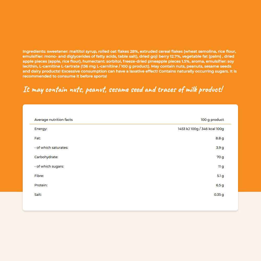 Zloženie: sladidlo: maltitolový sirup, lisované ovsené vločky 28%, extrudované cereálne vločky (pšeničná krupica, ryžová múka, emulgátor: mono- a diglyceridy mastných kyselín, jedlá soľ), sušené goji bobule 12,7%, rastlinný tuk (palmový), sušené kúsky jablka (jablko, ryžová múka), zvlhčovadlo: sorbitol, lyofilizované kúsky ananásu 1,5%, aróma, emulgátor: sójový lecitín, L-karnitín L-tartrát (136 mg L-karnitínu / 100 g produktu). Môže obsahovať orechy, arašidy, sezamové semienka a mliečne výrobky! Nadmerná konzumácia môže mať laxatívny účinok! Obsahuje prirodzene sa vyskytujúce cukry. Odporúča sa konzumovať pred športom!