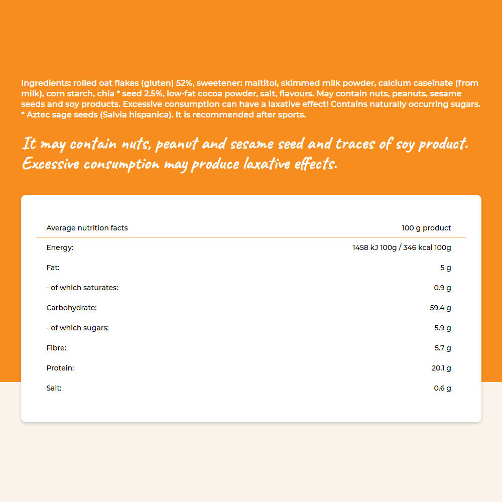 Zloženie: ovsené vločky (lepok) 52 %, sladidlo: maltitol, odstredené sušené mlieko, vápenatý kazeinát (z mlieka), kukuričný škrob, chia semienka 2,5 %, nízkotučný kakaový prášok, soľ, arómy. Môže obsahovať orechy, arašidy, sezamové semienka a sójové produkty. Nadmerná konzumácia môže mať laxatívny účinok! Obsahuje prirodzene sa vyskytujúce cukry.