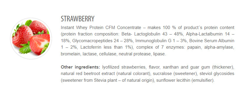 • Bielkovinovú časť výrobku tvorí výlučne instantný srvátkový koncentrát CFM, najvyššej kvality z krajín EÚ.