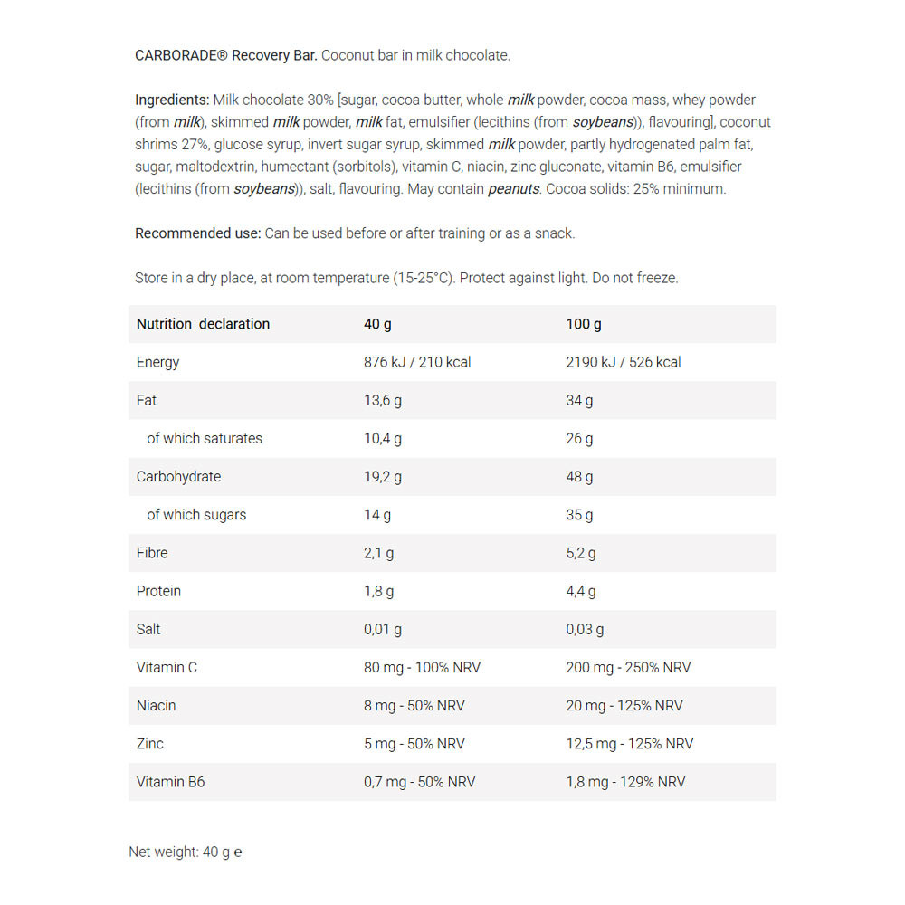 Tyčinka CARBORADE® Recovery Bar s príchuťou kokosu je ideálnou voľbou pred alebo po tréningu, alebo aj medzi jedlami, kedykoľvek potrebujete rýchlu a účinnú energiu. Vďaka vysokému obsahu sacharidov kokosová tyčinka v mliečnej čokoláde pomáha doplniť zásoby energie a podporuje regeneráciu.