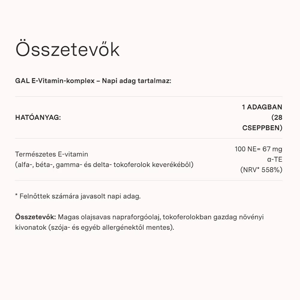 Rastlinný extrakt bez sóje, ktorý obsahuje všetky 4 členy skupiny vitamínu E, bol rozpustený v slnečnicovom oleji s nízkym obsahom Ω6. Môžete tak získať prírodný komplex vitamínu E bez kapsúl. Vitamín E je alfa-tokoferol, ktorý je široko používaný, ale v prírode sa ako taký vyskytuje len zriedkavo, vždy sú tu beta, gama a delta-tokoferoly, ktorých význam je predmetom čoraz častejšieho výskumu.