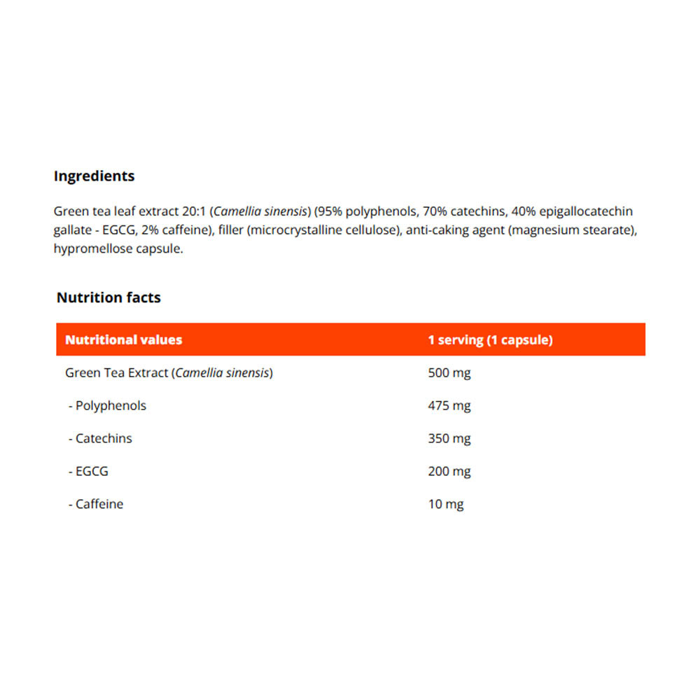 Výživový doplnok. Neprekračujte odporúčaný denný príjem. Tento produkt nie je náhradou pestrej a vyváženej stravy. Obsahuje kofeín (10 mg na dennú dávku). Nie je určené pre deti do 18 rokov, tehotné a dojčiace ženy. Nemal by sa užívať, ak v ten istý deň konzumujete iné produkty obsahujúce zelený čaj. Nemal by sa konzumovať na prázdny žalúdok. Nekonzumujte 800 mg EGCG alebo viac za deň. Uchovávajte mimo dosahu malých detí.