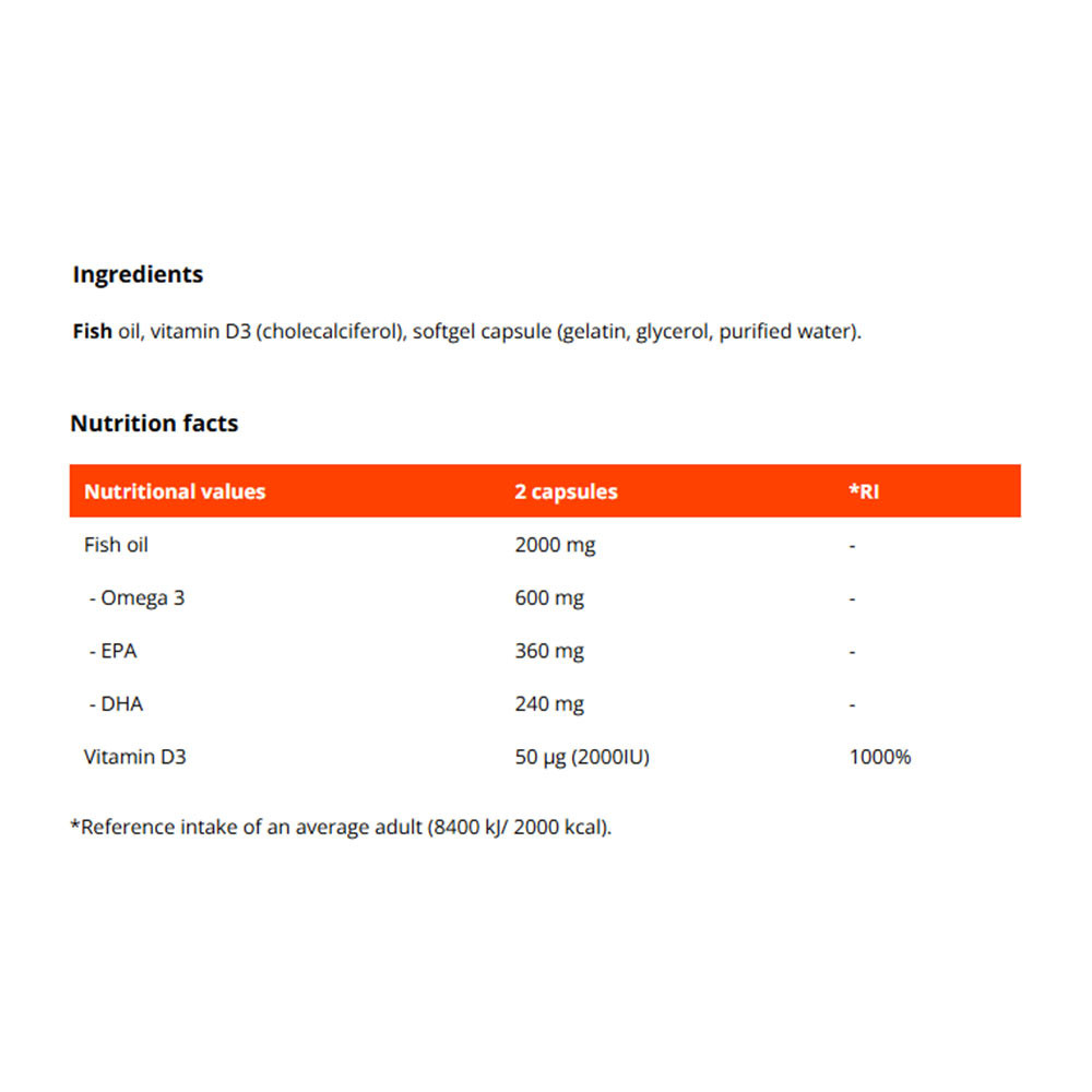 Omega 3 Vitamín D3 je komplex zdravých tukov vo forme omega 3 mastných kyselín a vitamínu D3 (cholekalciferol). Vďaka obsahu rybieho oleja je zdrojom eikosapentaenovej kyseliny (EPA) a dokozahexaenovej kyseliny (DHA). EPA a DHA obidve prispievajú k normálnej funkcii srdca. Na dosiahnutie tohto účinku treba užiť 250 mg EPA a DHA denne, čo jednoducho dosiahnete s týmto doplnkom. DHA samotná podporuje udržiavanie správnej funkcie mozgu a zdravého zraku pri celkovej dennej dávke 250 mg tejto látky.