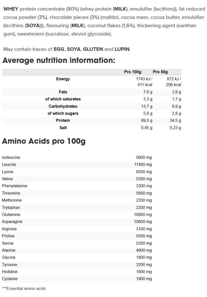 Odporúčaná denná dávka by sa nemala prekročiť. Nepoužívajte ako náhradu pestrej stravy. Uchovávajte mimo dosahu malých detí. Skladujte mimo dosahu tepla, vlhkosti a slnečného žiarenia. Bielkoviny prispievajú k rastu svalovej hmoty. Dôležitá je vyvážená a pestrá strava a zdravý životný štýl. Obsahuje prirodzene sa vyskytujúce cukry.