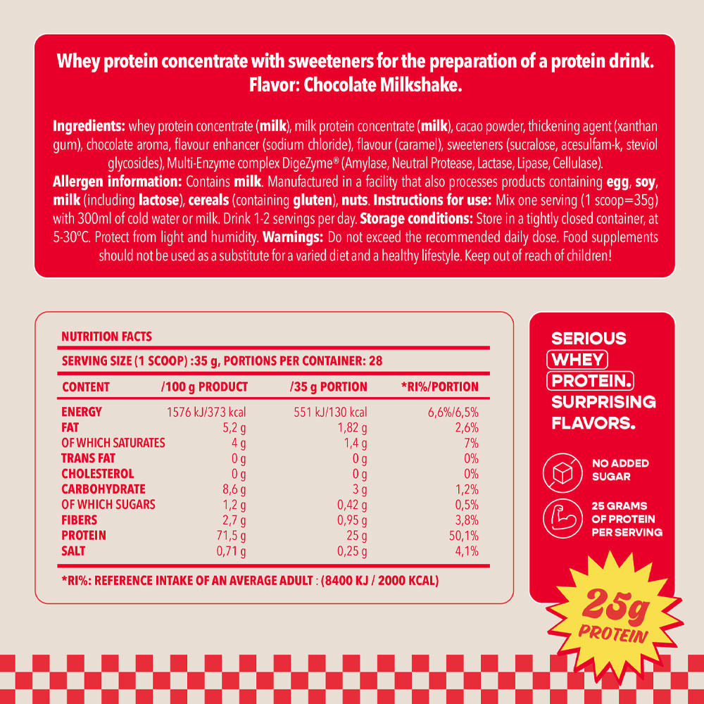 Zmiešajte 1 odmerku (35g) s 250 ml vody alebo mlieka v šejkri a dobre pretrepte.