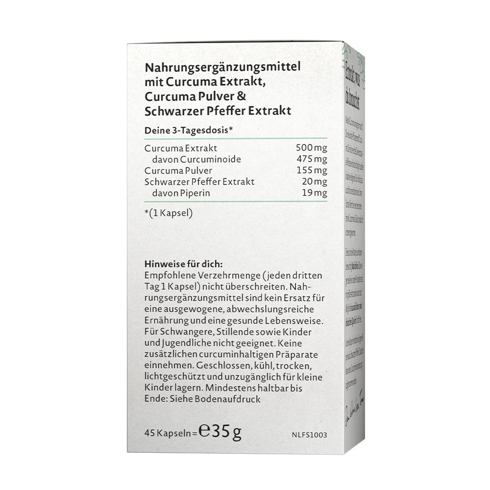 Čo robí kurkumu takou magickou? Sekundárna rastlinná zlúčenina kurkumín. Prírodný antioxidant, ktorý posilňuje rastlinu zvnútra. Aký skvelý vzor! Náš extrakt vám poskytuje mimoriadne vysoký obsah kurkumínu, prirodzene a šetrne získaný. Mimochodom, naše kapsuly obsahujú aj piperín z čierneho korenia. To umožňuje, aby sa náš kurkumín obzvlášť dobre vstrebával.