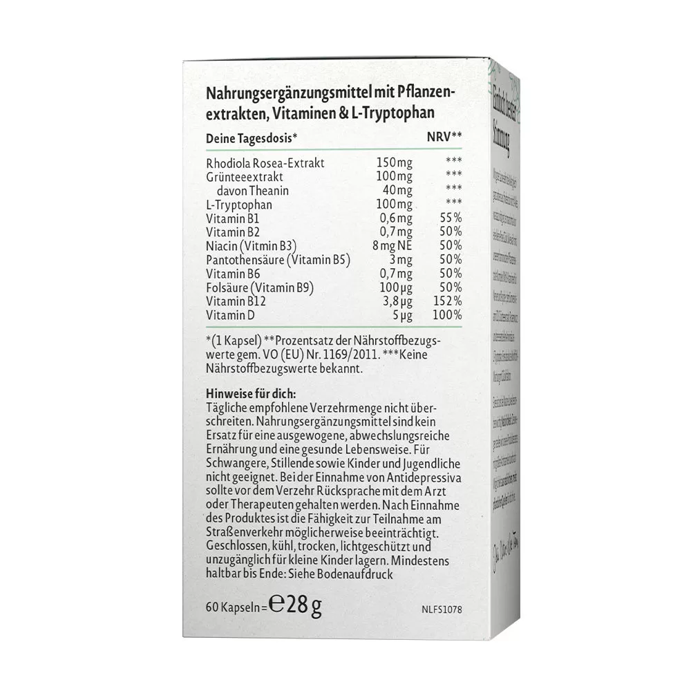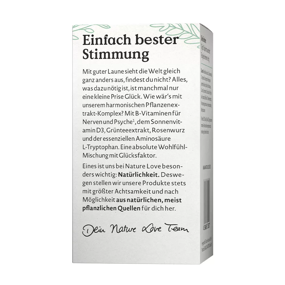 Non-GMOS dobrou náladou vyzerá svet úplne inak, čo poviete? Niekedy stačí len malá dávka šťastia. Teraz ju nájdete v našom harmonickom rastlinnom komplexe: so 7 esenciálnymi vitamínmi skupiny B na podporu nervov a psychiky, slnečným vitamínom D3, theanínom z extraktu zo zeleného čaju, vysokokvalitnou rozchodnicou a esenciálnou aminokyselinou L-tryptofán. Spolu ide o absolútne zloženie pre dobrú náladu s faktorom šťastia – a samozrejme úplne uvoľnene bez zbytočných prísad.