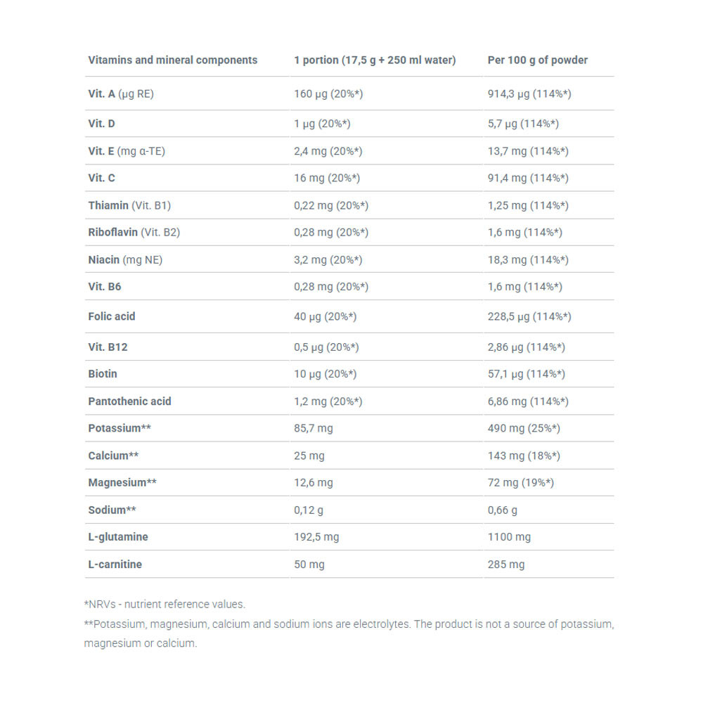 1 porcia denne počas tréningu. Rozpustite 1 porciu (17,5 g prášku = 1½ odmerky) v 250 ml vody, použite šejker aspoň 10 sekúnd.