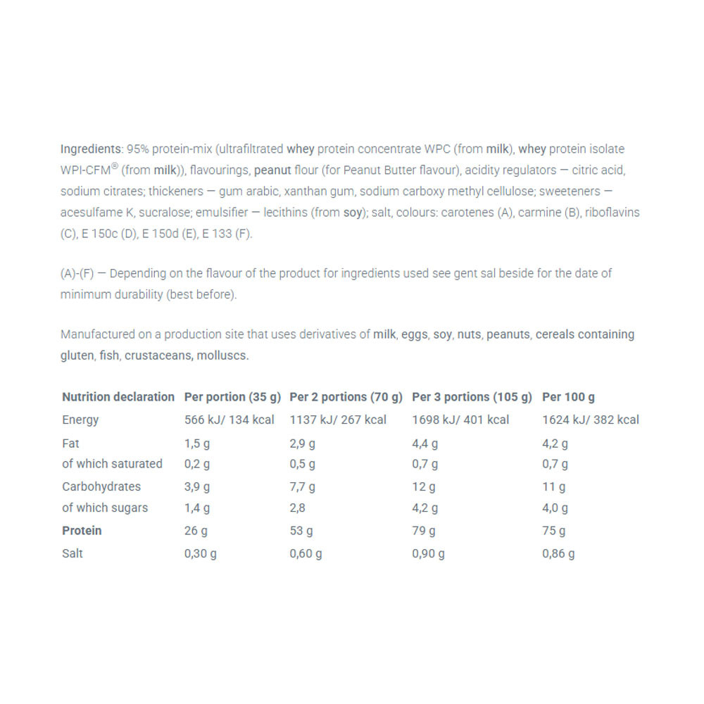 Doplnok stravy. Vysokoproteínový koncentrát v prášku. So sladidlami. Zmes vysoko kvalitného ultrafiltrovaného srvátkového proteínového koncentrátu a srvátkového proteínového izolátu. Produkt je určený pre fyzicky aktívnych ľudí a športovcov, ktorí sa usilujú o rozvoj svalovej hmoty.