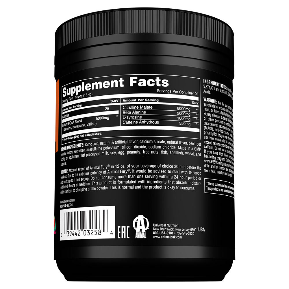 Keď sme formulovali Animal Fury, mali sme na mysli tento vzácny postoj. Rozhodli sme sa navrhnúť predtréningový prášok, ktorý by pomohol vážnym športovcom zostať v "zóne". Kombinácia osvedčených predtréningových základov, ako je citrulín malát, beta alanín, L-tyrozín a bezvodý kofeín, v účinných dávkach s neuveriteľnými piatimi gramami aminokyselín s rozvetveným reťazcom (BCAA), každá odmerka Animal Fury predstavuje pekelne silný úder na budovanie svalov. Výkonnosť. Zameranie. Energia. To je silný zásah. Žiadne kecy. Vďaka tomu, že sa nepoužívajú žiadne patentované zmesi, môžete si byť istí, že presne viete, čo dostanete v každej naplnenej šejkerovej šálke Fury