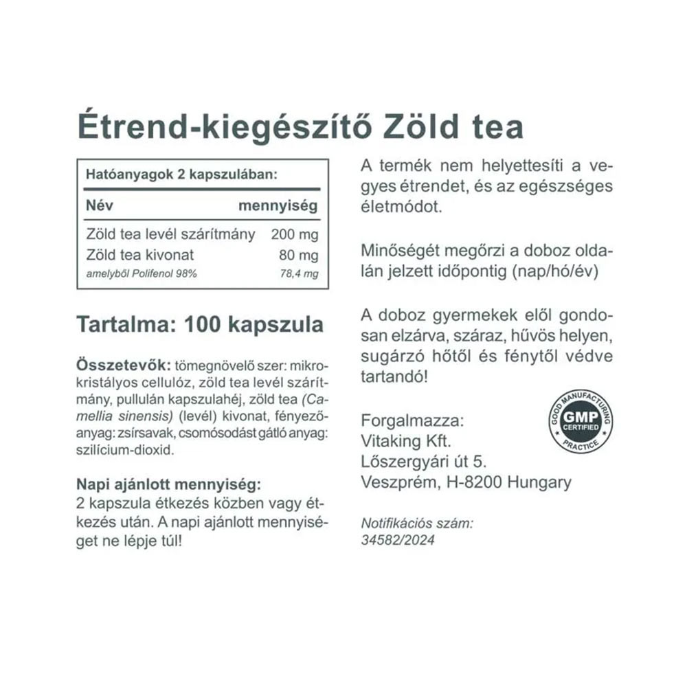 Je bohatý na rastlinné zlúčeniny nazývané polyfenoly, ktoré sa nestrácajú počas procesu fermentácie, ktorým prechádzajú iné čaje. Najdôležitejším z polyfenolov v zelenom čaji je epigalokatechín galát alebo EGCG.POUŽÍVANIE (1 dávka = 2 kapsule)