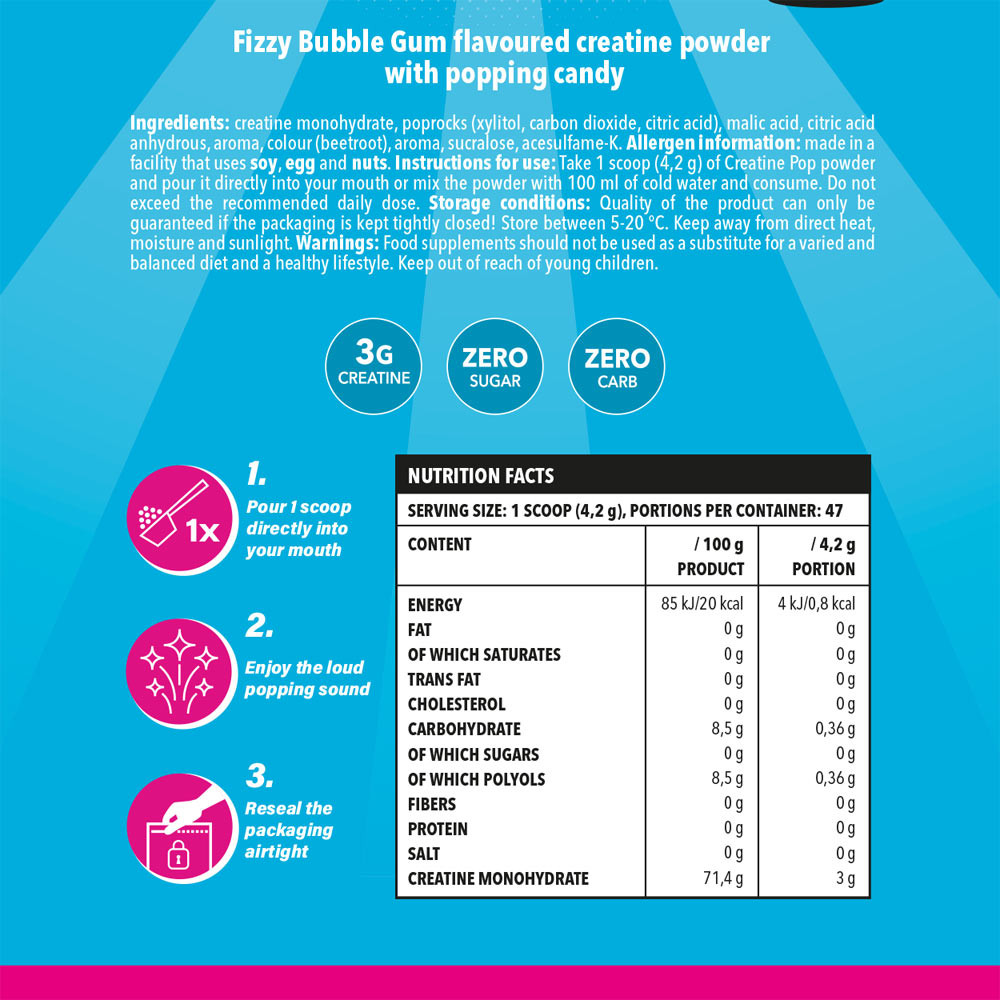 Každá odmerka obsahuje čistý kreatín monohydrát napustený pravými praskajúcimi cukríkmi, ktoré premenia vašu dennú dávku na výbušný zážitok.